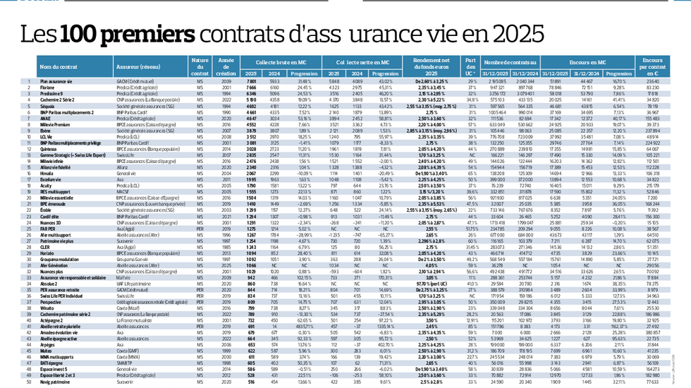 Les 100 premiers contrats d'assurance vie en 2025