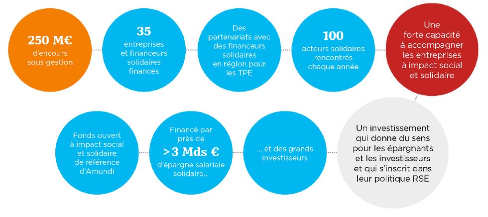 Depuis 2010, avec la loi de modernisation de l’économie et la volonté forte d’Amundi de développer l’investissement à impact (ou impact investing), nous avons regroupé ces fonds de partage en un seul fonds unique d’ISR. Il s’agit d’un fonds dit 90/10 dont 90 % de l’encours est investi sur les marchés cotés dans des titres d’ISR (c’est-à-dire avec une notation sur les critères environnement, social et gouvernance ou ESG) et 10 % est investi dans des entreprises non cotées à impact social, une poche dite d’investissement à impact social et solidaire (ISS). Ce format 90/10 est une spécificité française très innovante au service de l’entrepreneuriat social permettant à tous les épargnants qui le souhaitent de participer au développement de ce nouveau pan de l’économie.